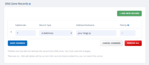 Go to your dashboard and visit your Domain Management section. Then click on the action button to the right of the domain you’re connecting to your blog.